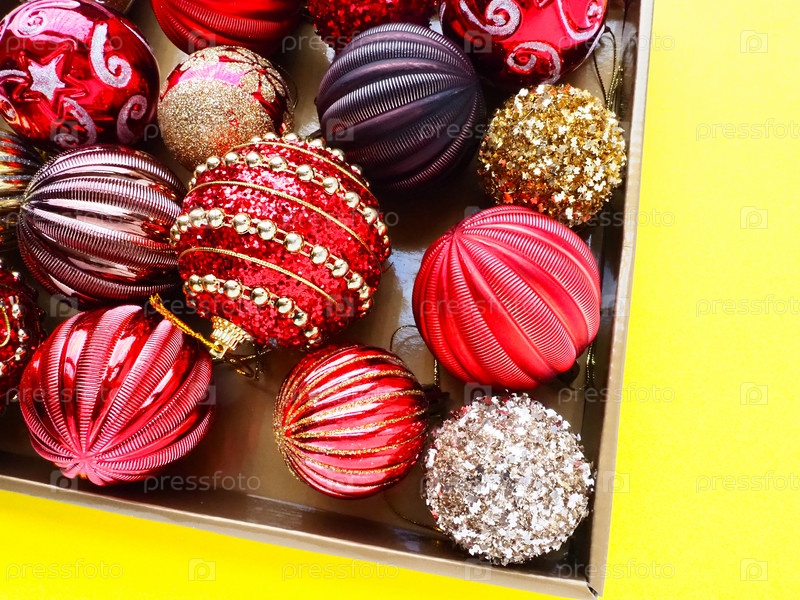 Рождественские украшения в коробке на желтом фоне. Красивые красные и золотые шарики с блестками и полосками. Подготовка к новогодним рождественским праздникам. Красивые украшения. Копирование пространства