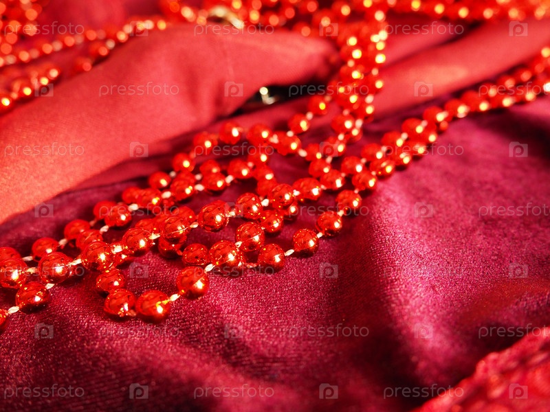 Красные красивые бусы на ярко-алом бархате. Красивые роскошные женские украшения на мягкой ткани. Квартира лежала крупным планом. Женские вещи и косметика. Предметы в качестве фона. Мягкий фокус