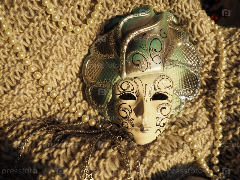 Карнавальная маска на вязаном фоне с бисером и блестками. Элемент костюма карнавального фестиваля