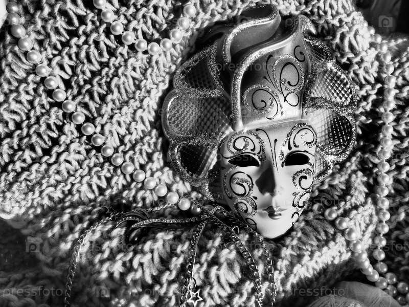 Карнавальная маска на вязаном фоне с бисером и блестками. Элемент костюма карнавального фестиваля. Черно-белое монохромное изображение