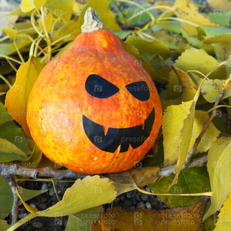 Хэллоуинская тыква с черным ртом и наклейками на глаза. Оранжевая овощная тыква лежит на осенних желтых листьях тополя. Тема Хэллоуина или Хэллоуина, канун всех святых или канун всех святых