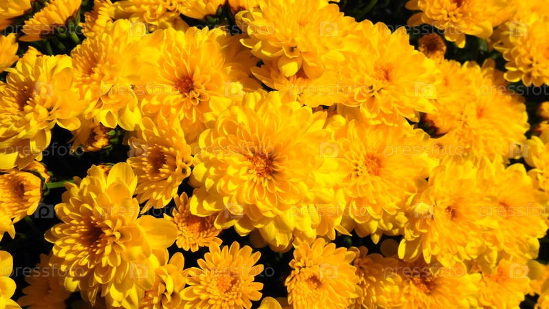 Хризантемы желтого цвета в букете. Крупный план. Поздравительная открытка. Осенние цветы семейства Астровые или Дендрантемы. Размытый мягкий фокус. Черный фон. Осенние садовые цветы
