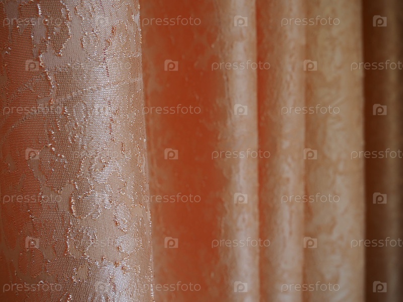 Полиэстеровые шторы крупным планом. Оранжевая набивная плотная ткань для внутренней отделки помещений, пошива штор, одежды, для обивки мягкой мебели. Блестящая ткань с текстурой
