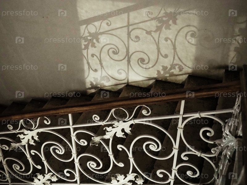 Таинственная лестница с коваными металлическими перилами ночью в темноте с тусклым светом. Отражение завитушек и узоров ковки. Перила и ступени. Лестница в музее Сремска Митровица Сербия