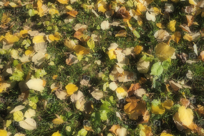 Желтые листья липы на траве. Городской парк. Опавшие листья европейской липы. Молодые растения пробиваются сквозь траву. Газон в листопаде. Солнечная тихая октябрьская погода. Бабье лето