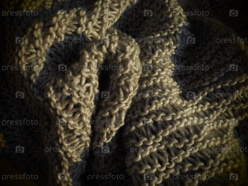 Вязаный шарф из объемной коричневой или серой пряжи. Пышная машинная вязка. Вариант теплого гардероба на осенне-зимний период. Вязать лицевыми, изнаночными петлями. Уютный домашний натюрморт