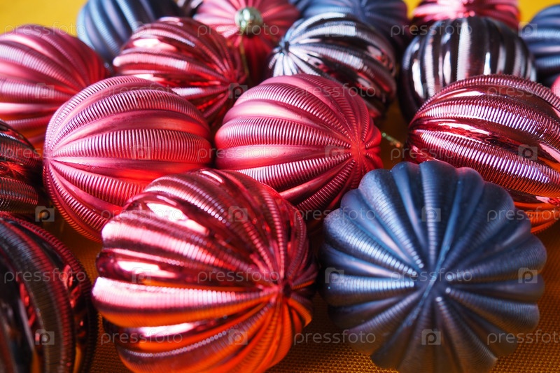 Разноцветные стеклянные блестящие шарики. Новогоднее рождественское украшение. Праздничный дизайн. Красные, синие и коричневые полосатые шары. Фон в канун Рождества и Нового года. Крупным планом красные рождественские украшения