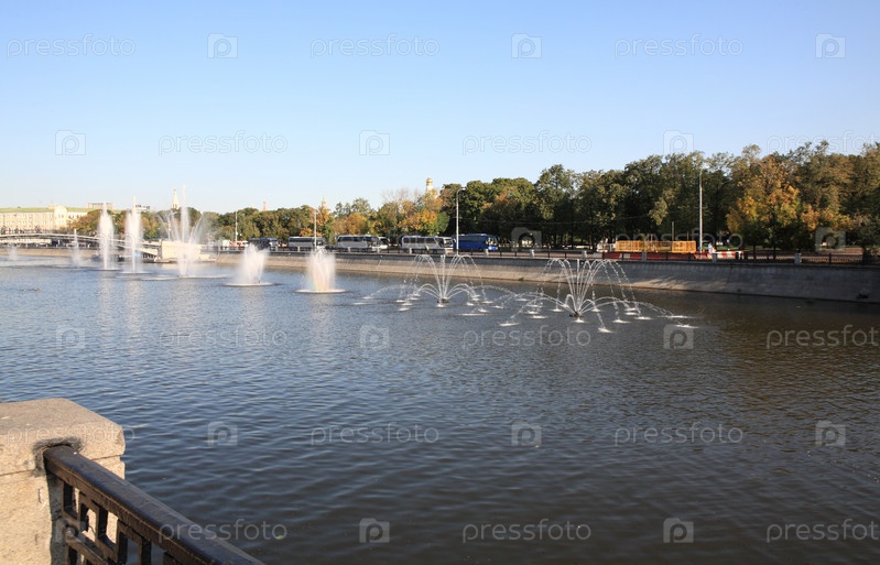 Много фонтанов на реке