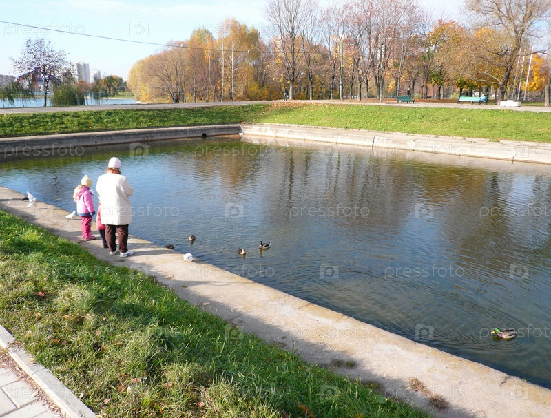 Женщина с детьми кормит птиц