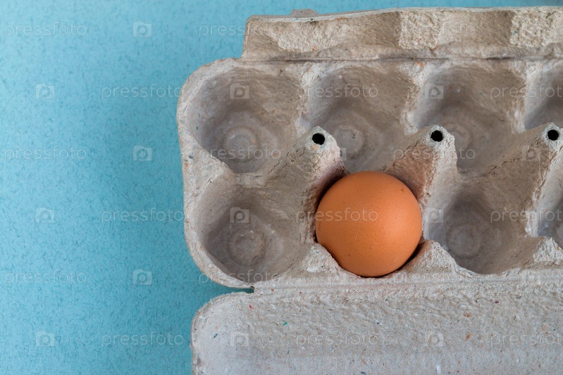 Коричневое куриное яйцо на голубом фоне, пустое место для текста
