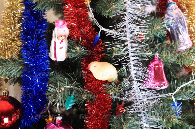 Игрушки на зеленой рождественской ели