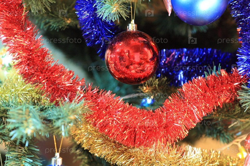 Игрушки на зеленой рождественской ели