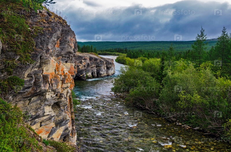 Горная река, текущая среди скал в лесной местности