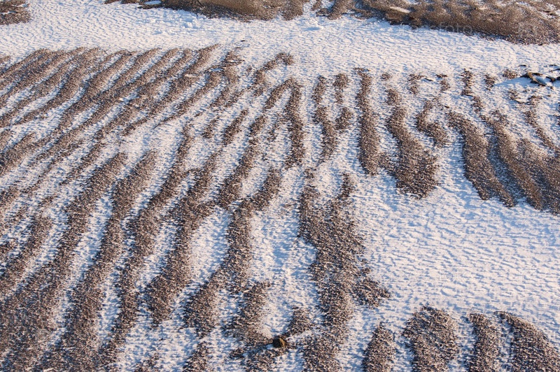 Россия. Дальний Восток, Курильские острова. Фактура волн на песчаном берегу припорошенном снегом в городе Курильск