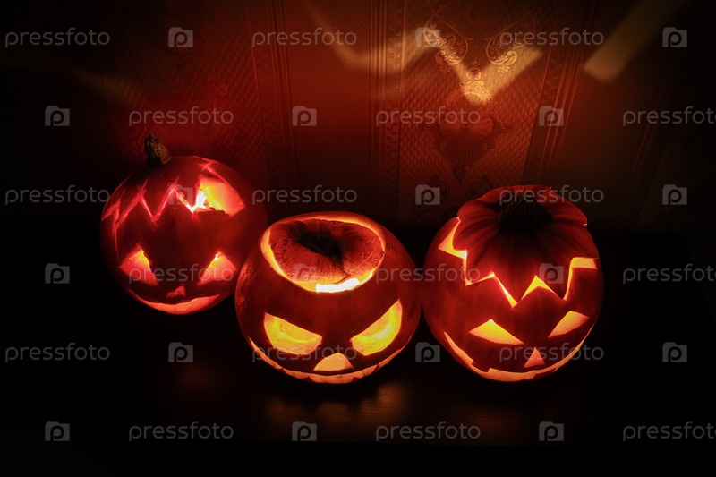 Три тыквы на Хэллоуин Jack-o'-lantern светит в темноте, вид сверху