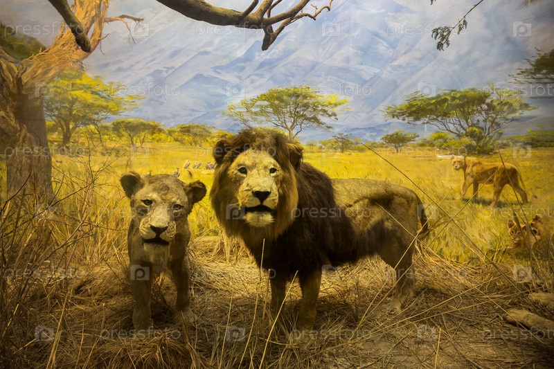 Чучела льва и львицы в африканской саванне в Зоологическом музее Зоологического института РАН - Санкт-Петербург, Россия, Ноябрь 2023