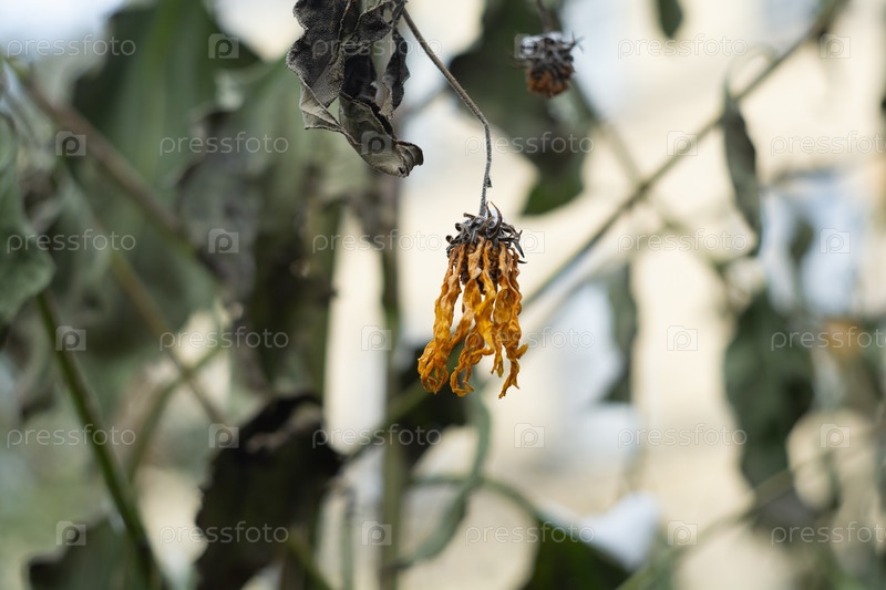 Желтый засохший цветок крупным планом на фоне дома