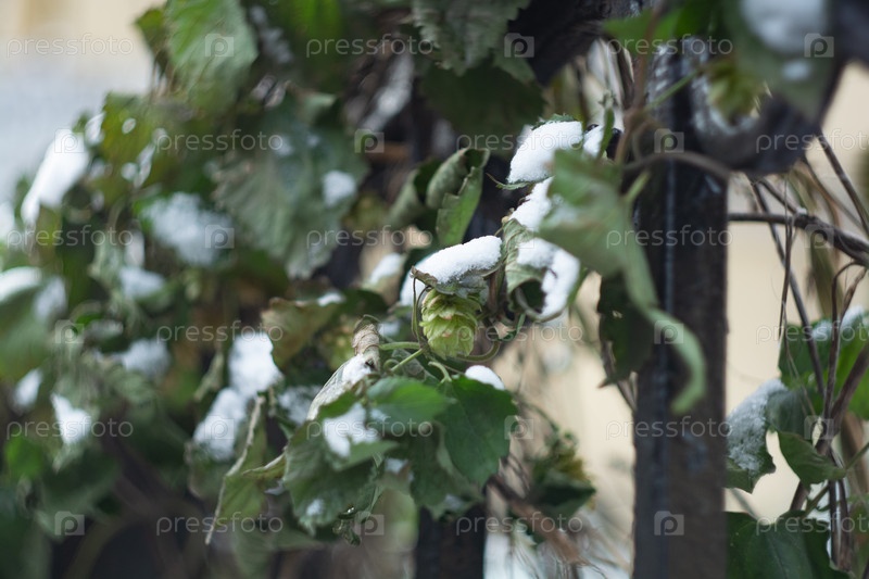 Зеленое растение с лежащим на листьях снегом оплетает железный забор крупным планом