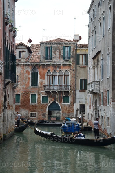 Каналы Венеции, окруженные домами в венецианском стиле, гондолы, гондольеры катают туристов
