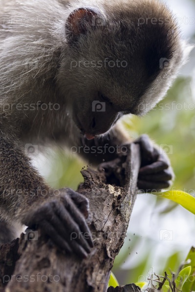 Обезьяна ищет еду в сухом дереве