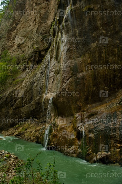 Россия. Северный Кавказ, Кабардино-Балкария. Живописный маловодный водопад среди замшелых скал в Чегемском ущелье