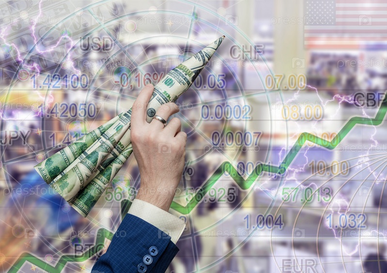 Денежная ракета в руках бизнесмена. Обмен валюты