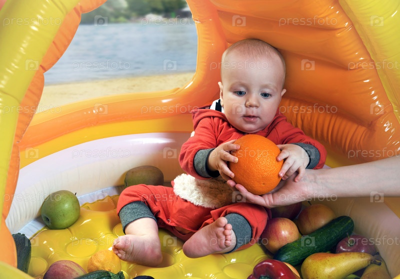 Маленький ребенок в надувном пляжном домике берет апельсин из рук мамы