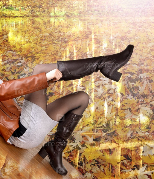Девушка надевает сапоги, лежа на абстрактном осеннем фоне