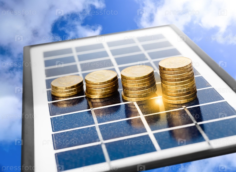 Стопки желтых монет на солнечной панели на фоне голубого неба с облаками. Концепция солнечной энергии, экономии и экологичности