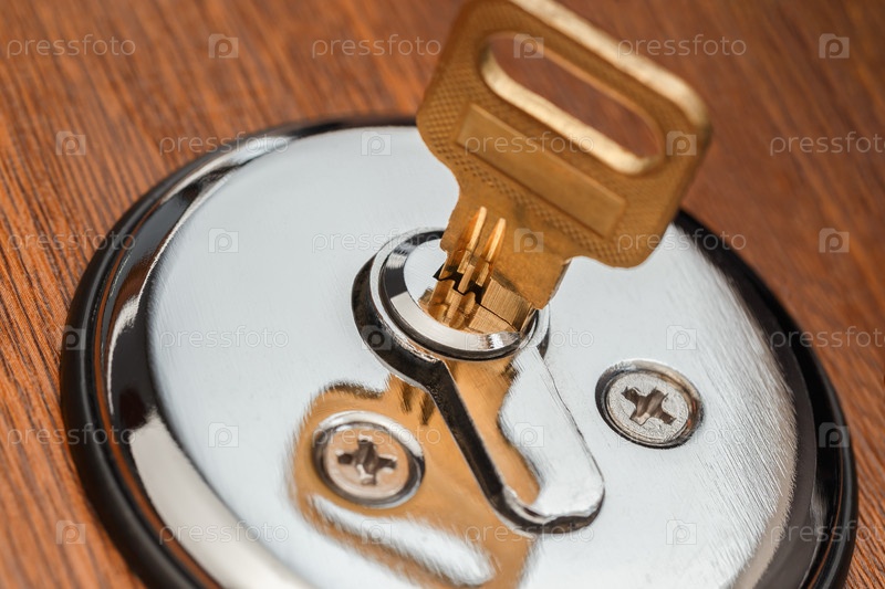 В цилиндрический замок вставляется желтый латунный ключ. Макрофотография