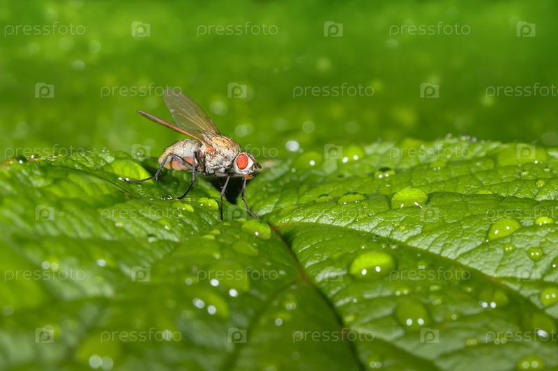 Муха-дрозофила сидит на зеленых листьях с каплями воды. Макро фото