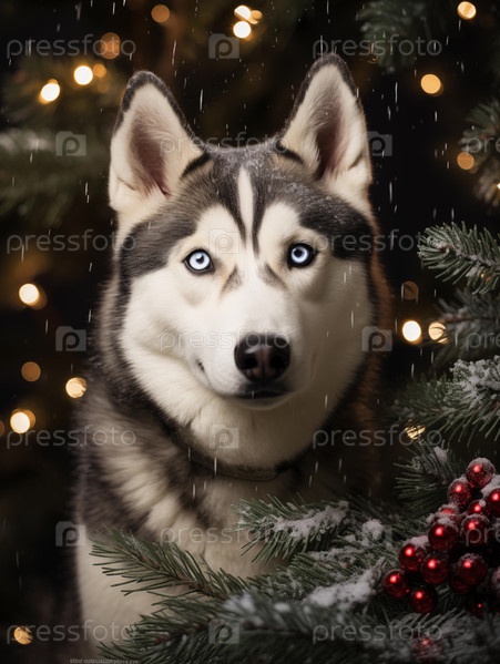 Сибирский хаски среди украшенных елок