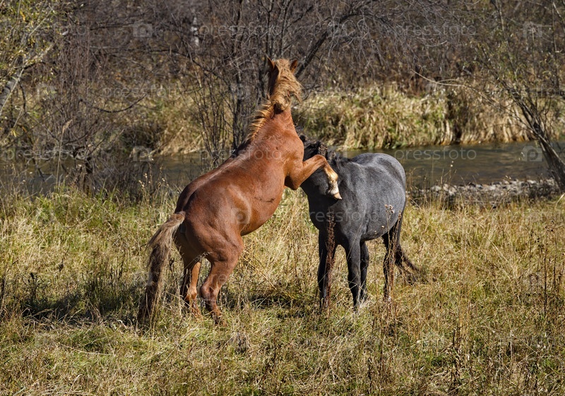 Россия. Горный Алтай. Противостояние двух молодых жеребцов на берегу рек Урсул