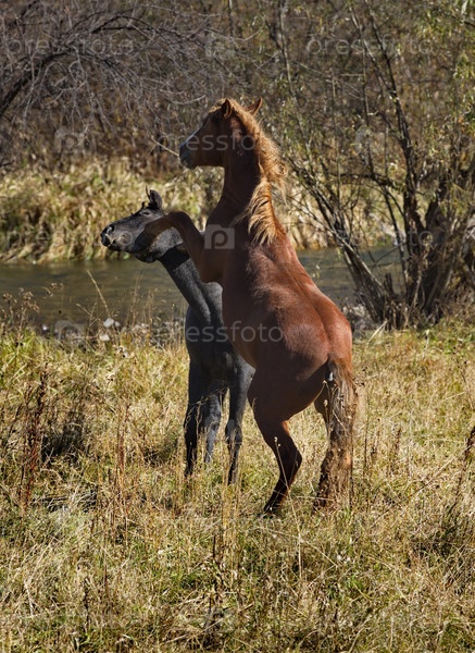 Россия. Горный Алтай. Противостояние двух молодых жеребцов на берегу рек Урсул