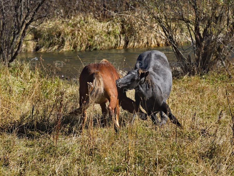 Россия. Горный Алтай. Противостояние двух молодых жеребцов на берегу рек Урсул