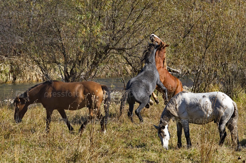 Россия. Горный Алтай. Противостояние двух молодых жеребцов на берегу рек Урсул