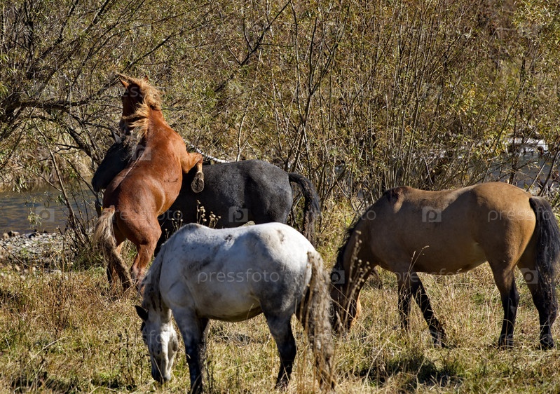 Россия. Горный Алтай. Противостояние двух молодых жеребцов на берегу рек Урсул