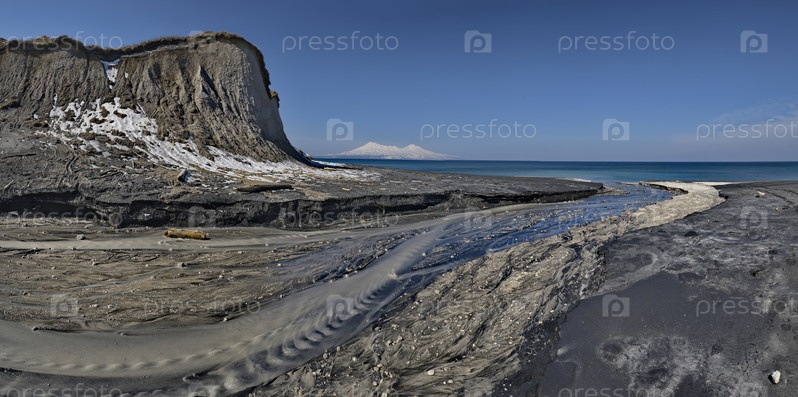 Россия. Дальний Восток, Курильские острова. Вид на холодную гладь Охотского моря на фоне заснеженных вулканов, окруженных базальтовыми скалами