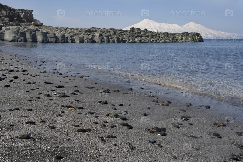 Россия. Дальний Восток, Курильские острова. Вид на холодную гладь Охотского моря на фоне заснеженных вулканов, окруженных базальтовыми скалами