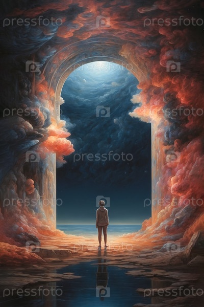 Женщина среди сказочных облаков стоит спиной, создано с помощью искусственного интеллекта