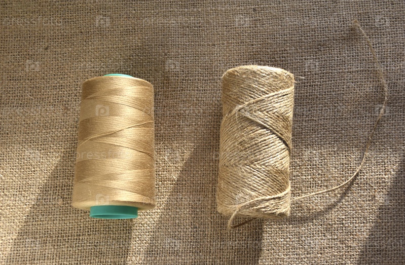 Мотки ниток на мешковине. Желтые нитки на грубой ткани