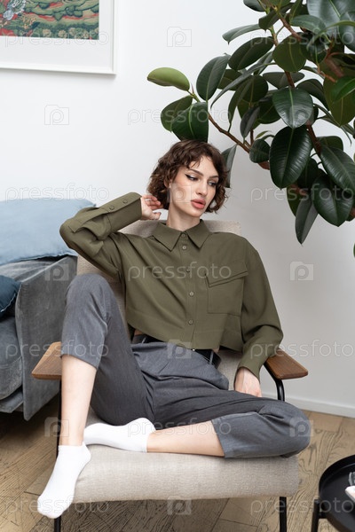 Молодая красивая женщина позирует в зеленой рубашке в студии