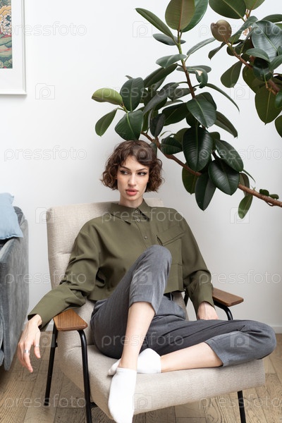 Молодая красивая женщина позирует в зеленой рубашке в студии