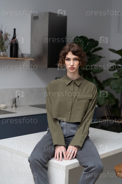 Молодая красивая женщина позирует в зеленой рубашке в студии
