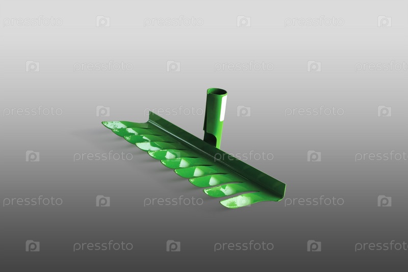 Зеленые садовые грабли. Крупный план. Изолированные на сером фоне