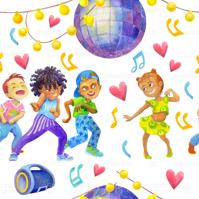 Акварельный бесшовный паттерн с танцующими детьми и элементами вечеринки