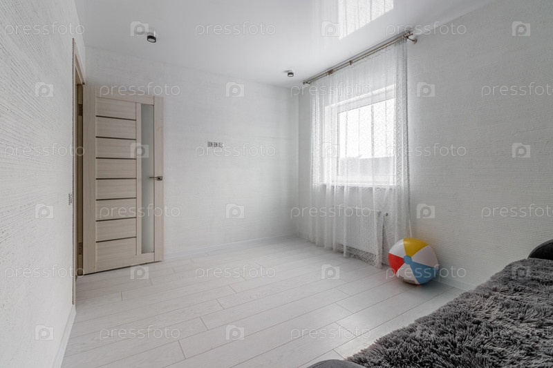 Пространство пустой белой детской комнаты с диваном и красочным надувным мячом