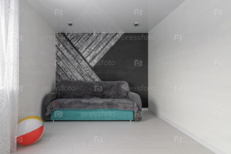 Пространство пустой белой детской комнаты с диваном и красочным надувным мячом