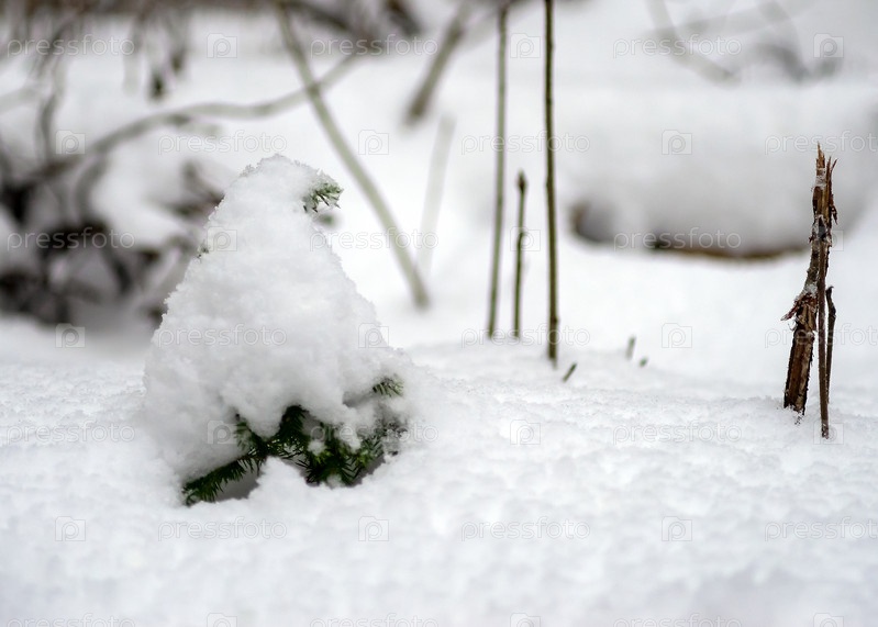 Маленькая ель покрыта снегом от вершины до корня. Из-под снега виднеется небольшая часть верхних и часть нижних ветвей. Задняя часть изображения размыта