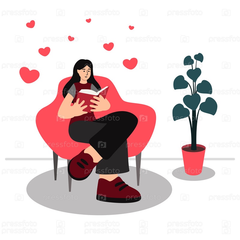 Девушка читает книгу любовного романа, сидя в помещении изолированный вектор